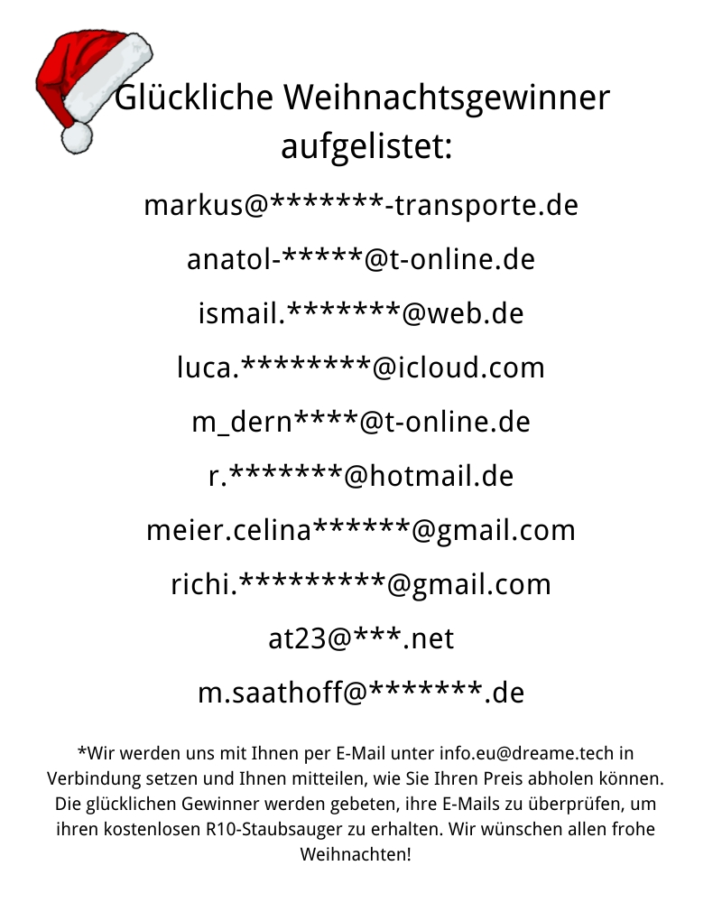 *Wir werden uns mit Ihnen per E-Mail unter info.eu@dreame.tech in Verbindung setzen und Ihnen mitteilen, wie Sie Ihren Preis abholen können. Die glücklichen Gewinner werden gebeten, ihre E-Mails zu überprüfen, um ihren kostenlosen R10-Staubsauger zu erhalten. Wir wünschen allen frohe Weihnachten!