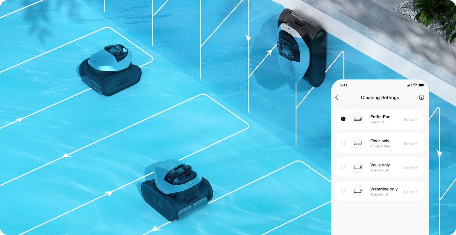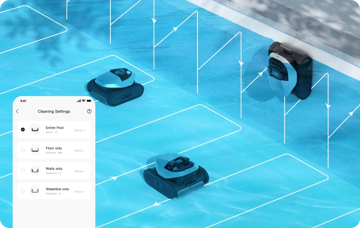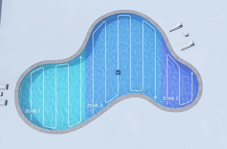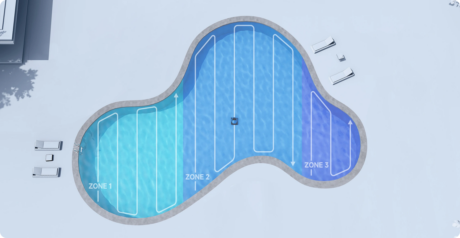 Der Z1 Pro erkennt automatisch die Poolform und teilt den zu reinigenden Bereich intelligent in Reinigungszonen ein. Jede dieser Reinigungszonen wird mithilfe eines anpassungsfähigen S-förmigen Pfades gereinigt, wodurch sowohl die Effizienz als auch die Gründlichkeit maximiert werden.