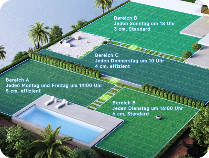 Die innovative Funktion für zwei Zeitpläne* des A2 eignet sich für saisonal unterschiedliche Umgebungen und Graswachstumsraten. Sie können damit saisonale Mähpläne erstellen und individuell an den Zustand Ihres Rasens anpassen.