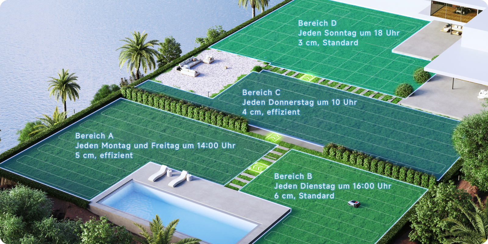 Perfekt für Grundstücke mit getrennten Gärten vor und hinter dem Haus: Mit dem A2 lassen sich zwei unabhängige Karten erstellen und verwalten. Richten Sie individuelle Mähpläne für jeden Bereich ein – dies spart Zeit und macht einen zusätzlichen Mäher überflüssig. Ideal auch für Besitzer mehrerer Immobilien.