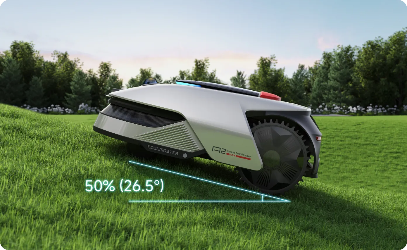 Der Nabenmotor des A2 steigert den maximalen Neigungswinkel auf 50 % (26,5°), ermöglicht eine bessere Traktion und sorgt so für ein sichereres und gleichmäßigeres Mähen an Hängen.