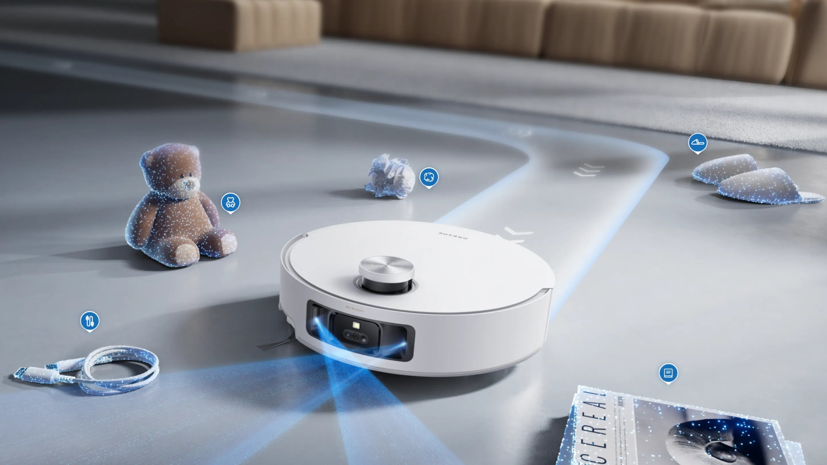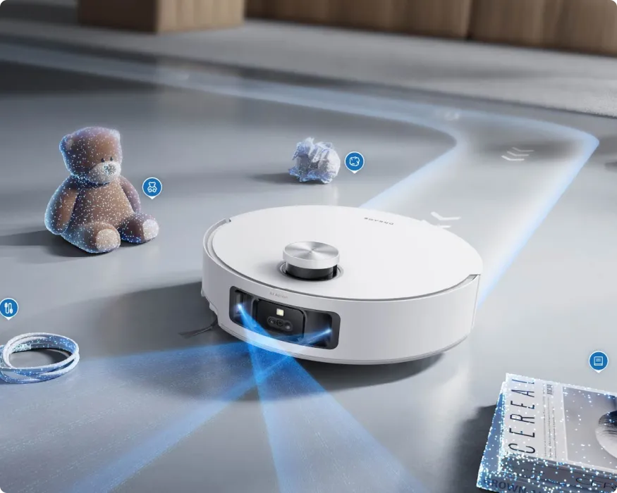 Kann dank strukturiertem 3D-Licht, LED-Licht und KI-Action-Kamera Hindernisse präzise erkennen, mehr als 240 Objekte identifizieren und Schmutz in schlecht beleuchteten Bereichen erfassen – für eine sichere und gründliche Reinigung.