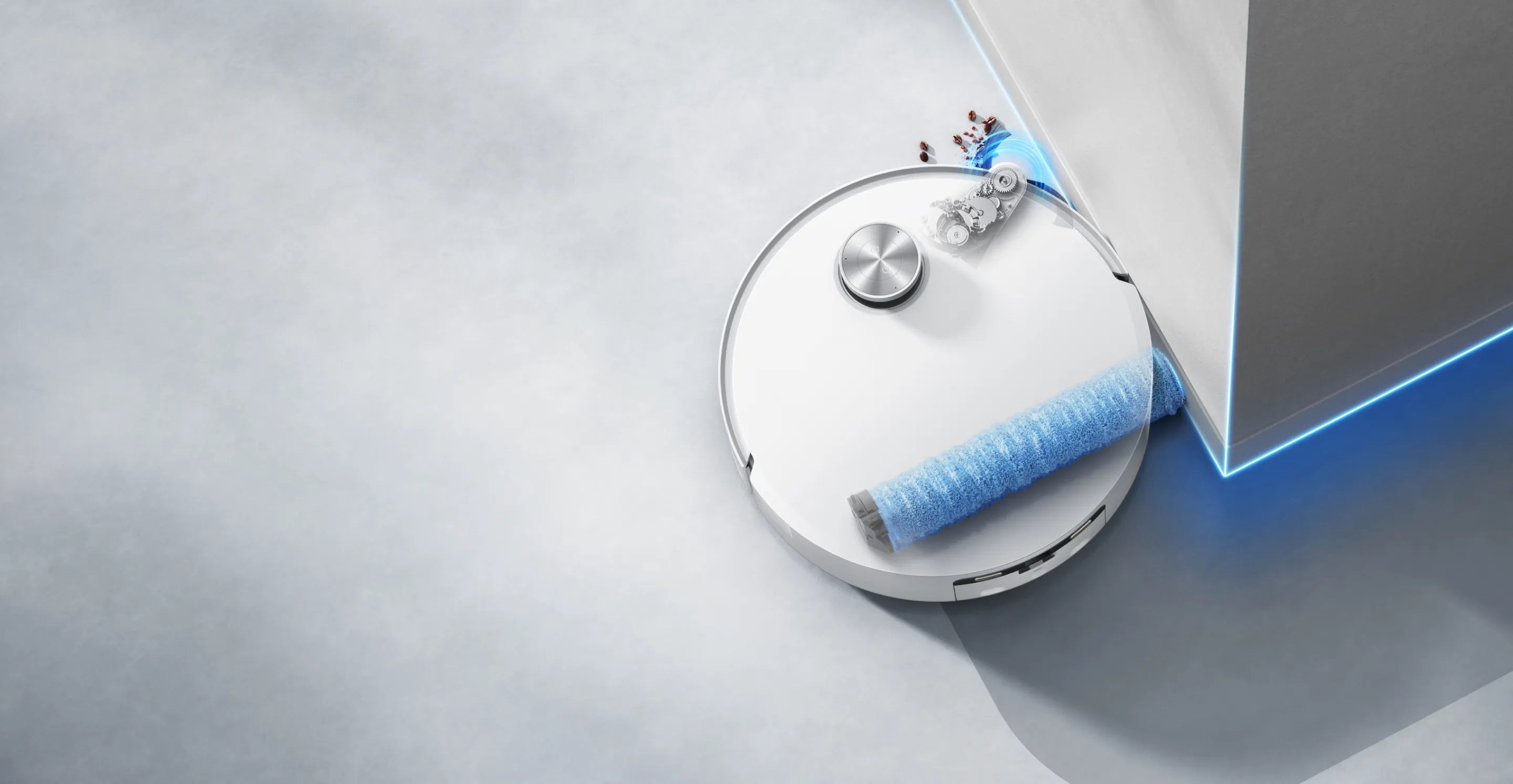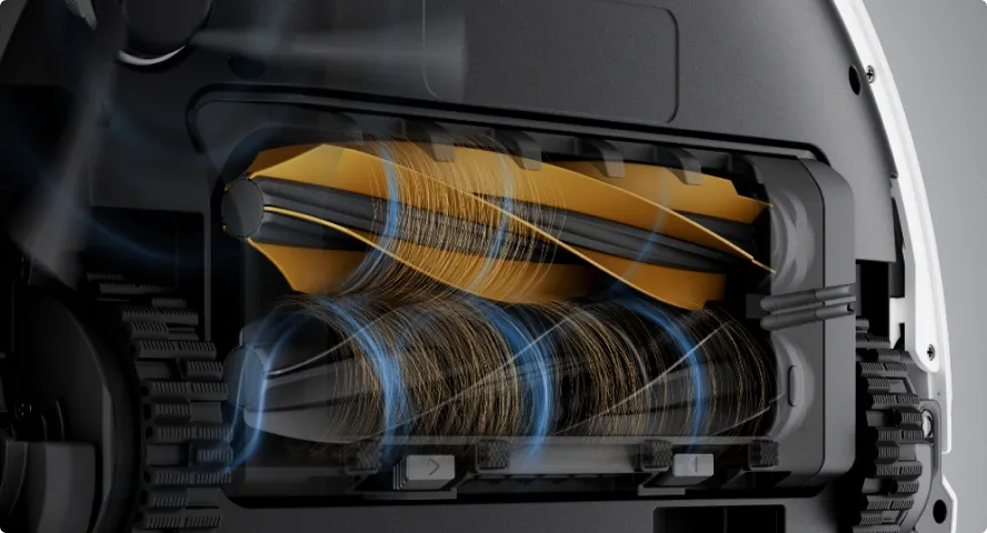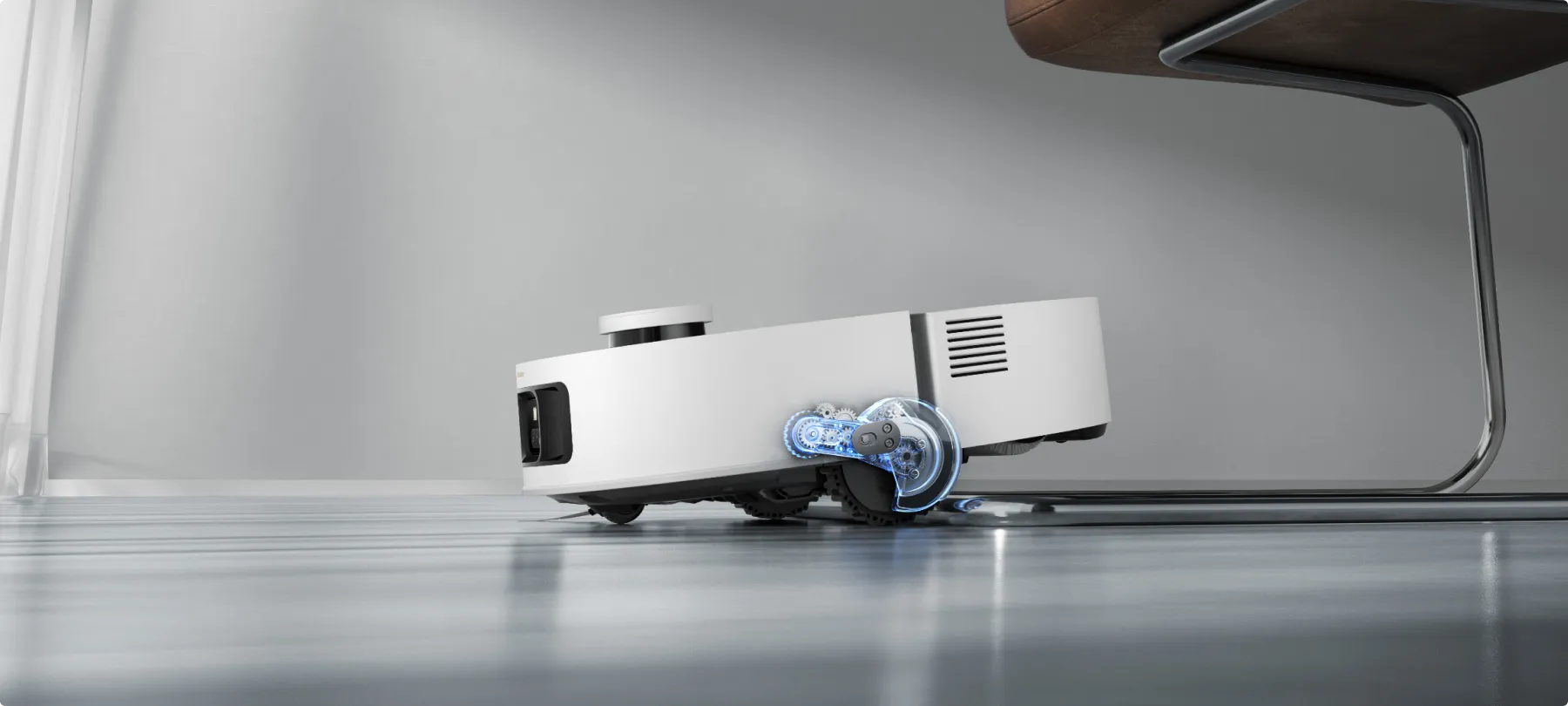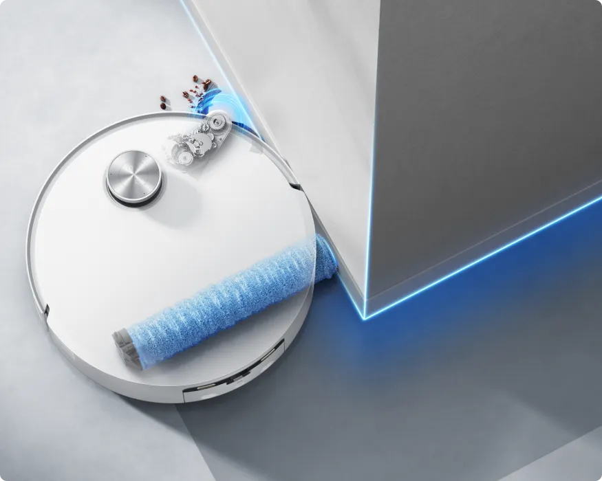Im Teppichüberquerungsmodus werden Fahrgestell, Seitenbürsten und Wischer-Pad des Saugroboters angehoben, um Teppiche schnell zu überqueren und mit der Reinigung anderer Bereiche und Räume fortzufahren.