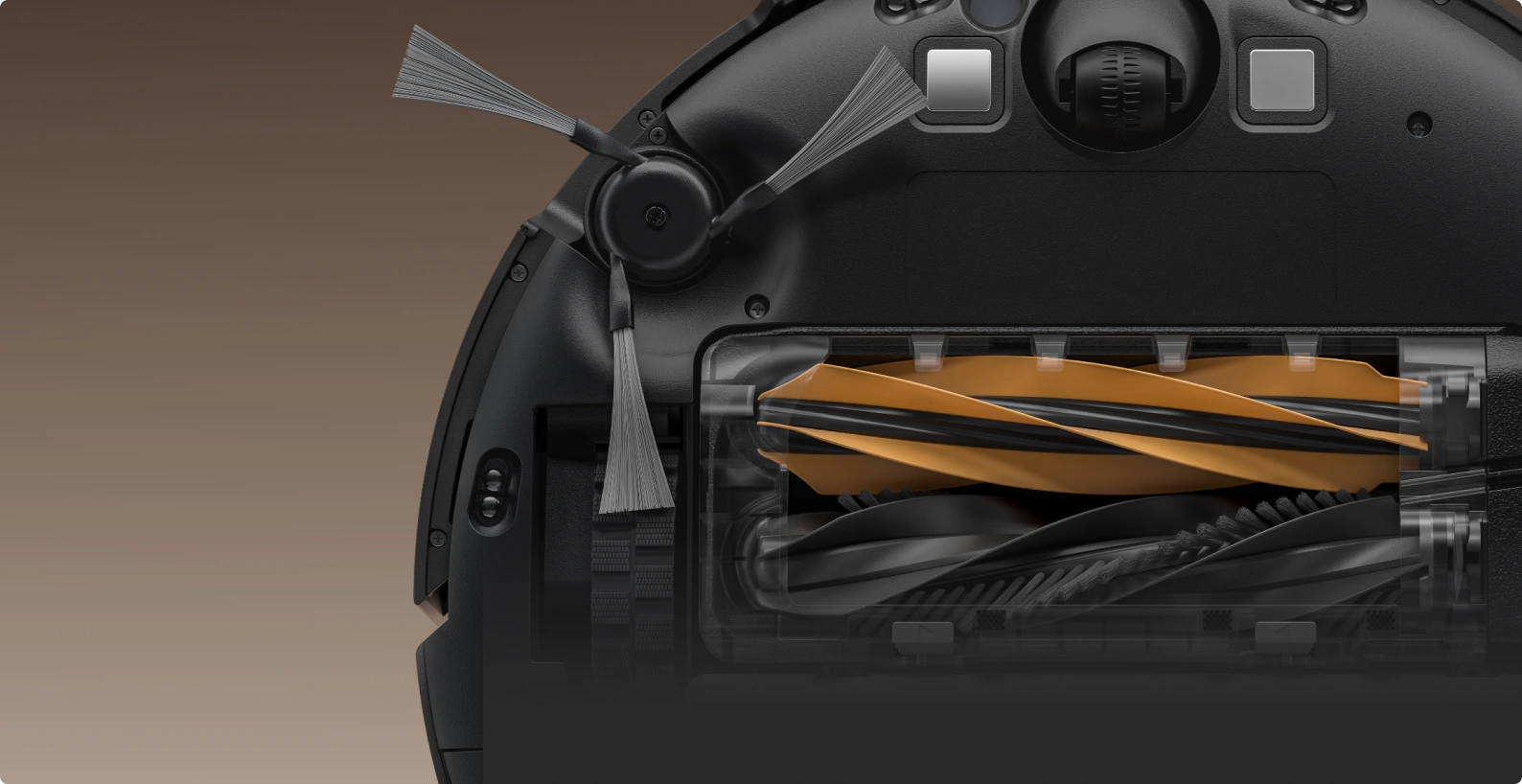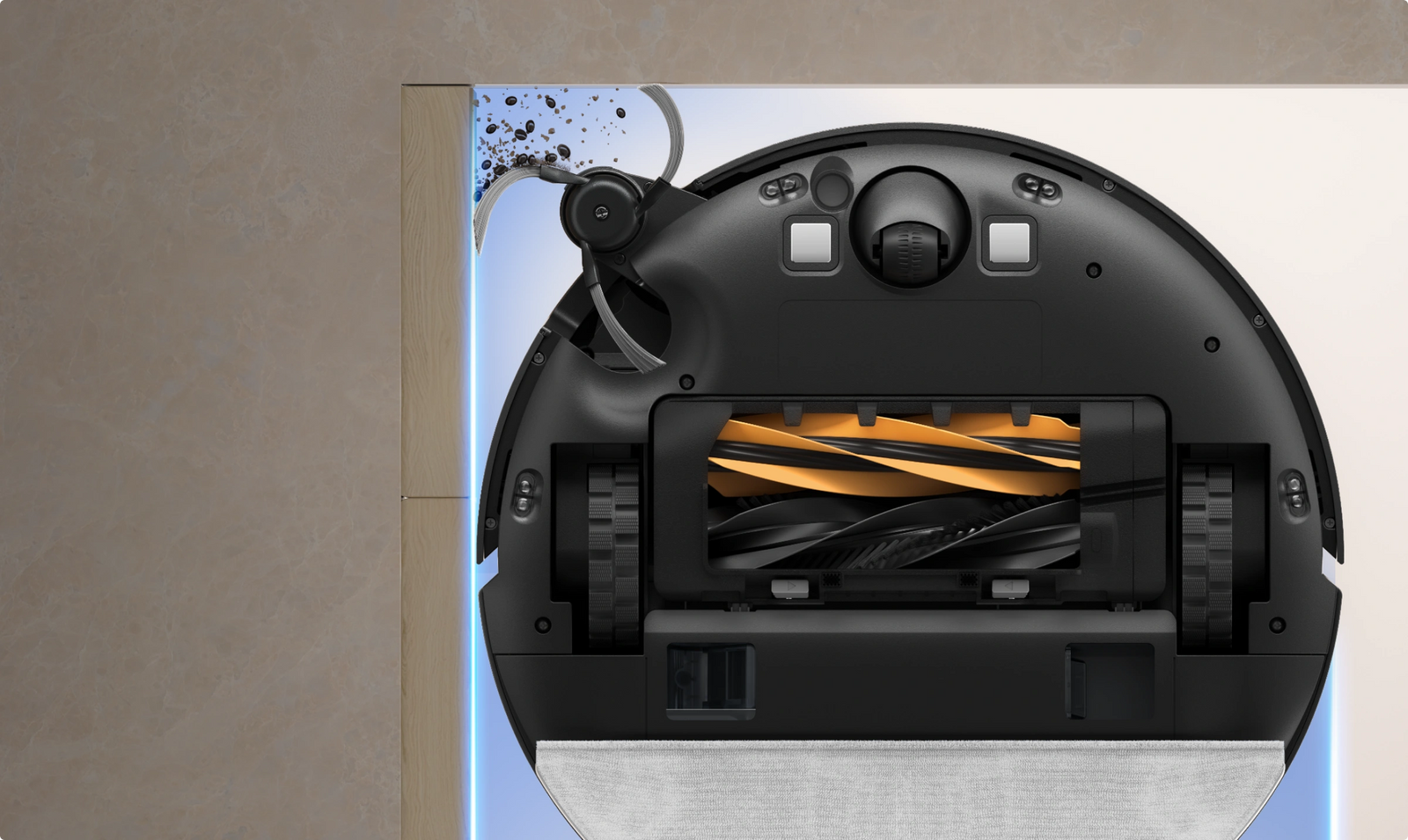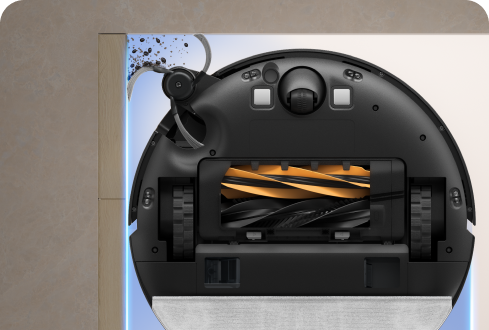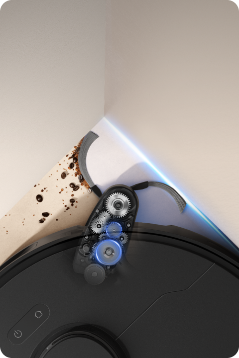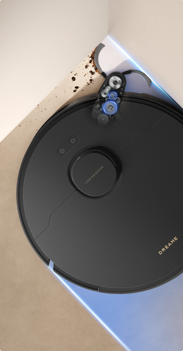 Schwierige Bereiche und rechtwinklige Ecken sind dank der ausfahrbaren Seitenbürste, die bis in engste Stellen, Spalten und unter niedrige Möbelstücke gelangt, kein Problem mehr.