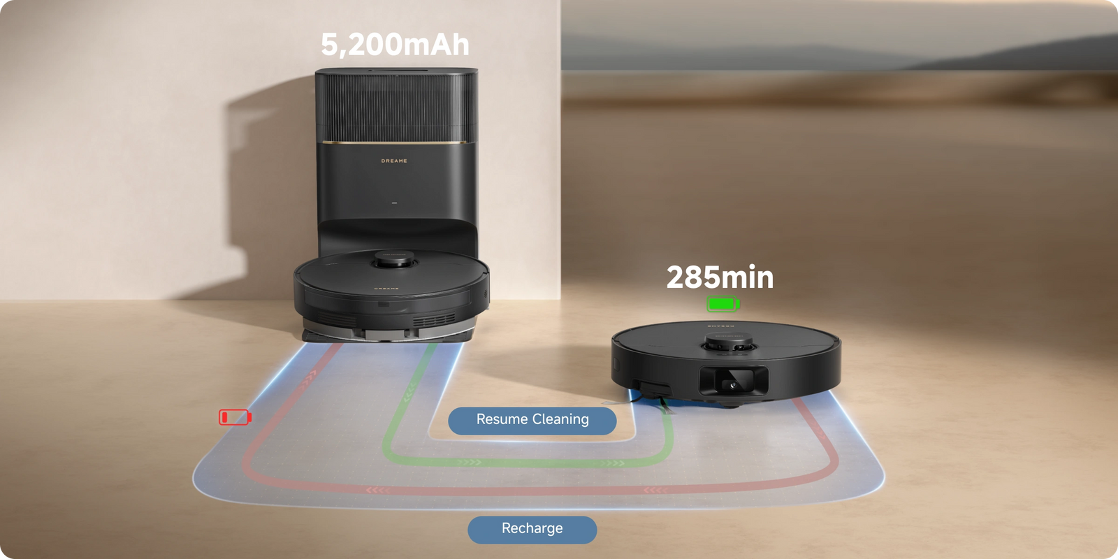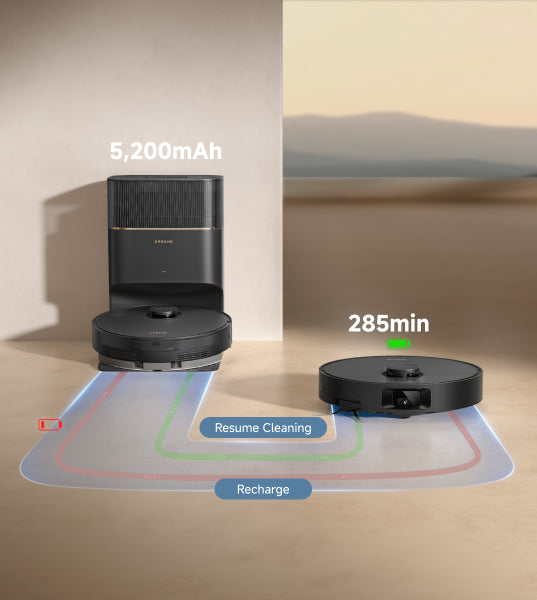 Längere Reinigungsdauer dank unserem großen Akku mit längerer Laufzeit. Bei geringer Akkuladung fährt der Saugroboter zum Aufladen automatisch zur Station und setzt die Reinigung danach fort.