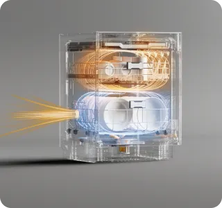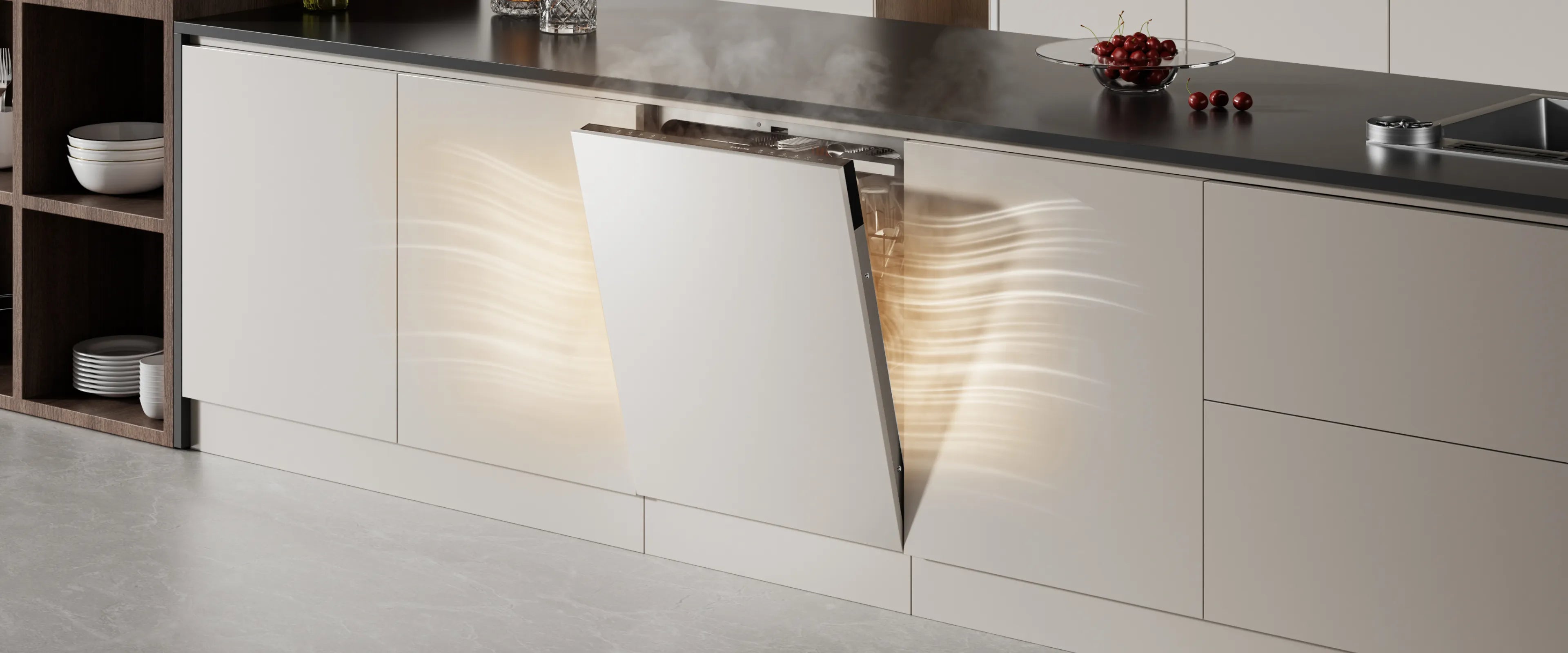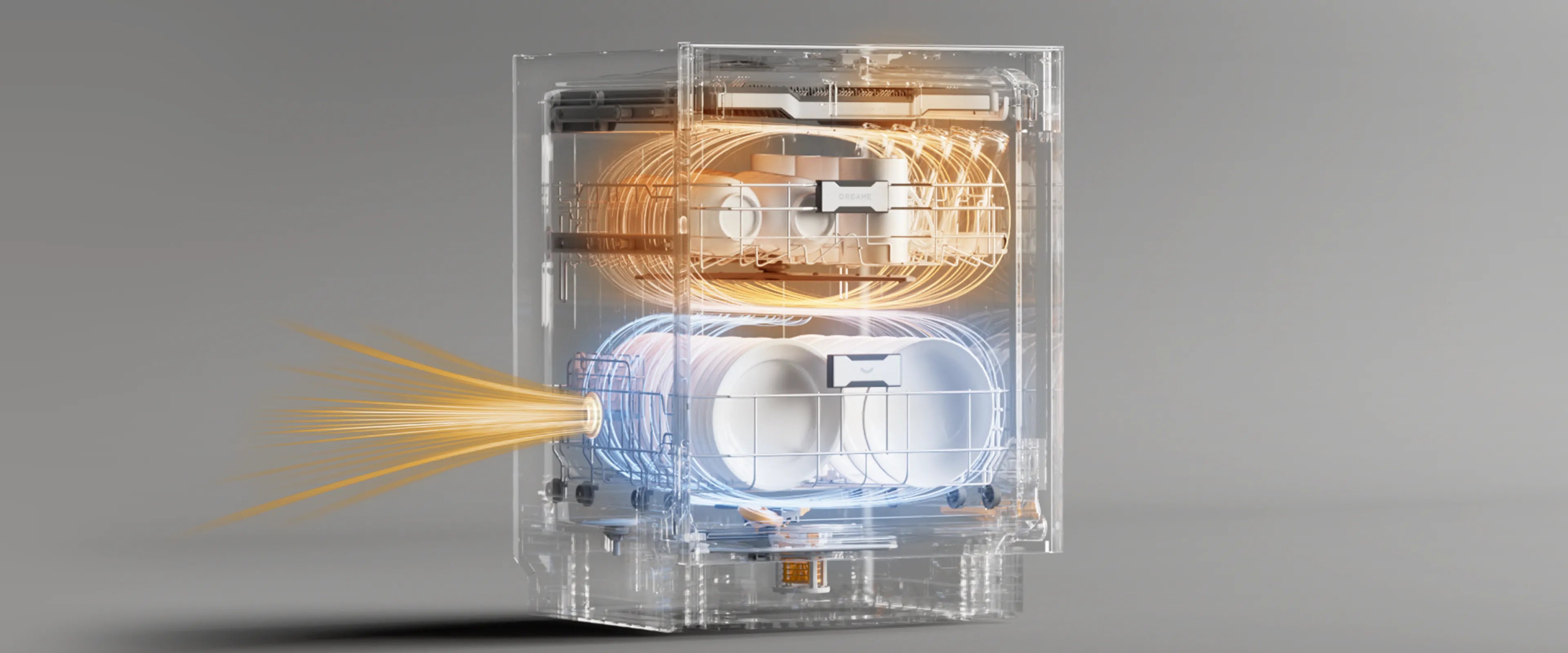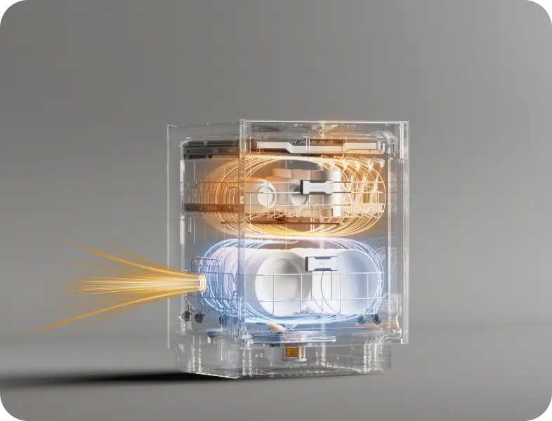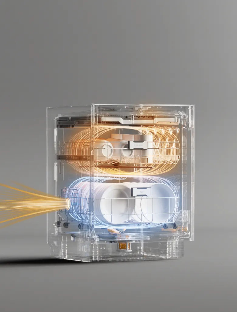 Der Geschirrspüler nutzt die Dual-Drying-Technologie mit automatischem Türöffnen und ventilatorunterstützter Trocknung, kombiniert mit PTC-Heißluftzirkulation bei geschlossener Tür. Dieses System sorgt für eine gründliche Trocknung sowohl des Geschirrs als auch des Innenraums und entfernt zuverlässig Wasserreste. In feuchten Umgebungen hält der Hochtemperaturluftstrom das Innere trocken und hygienisch und reduziert wirksam das Bakterienwachstum. Im Aufbewahrungsmodus sorgt der Wechsel von warmer und kühler Luft bis zu 15 Tage lang für Frische.
