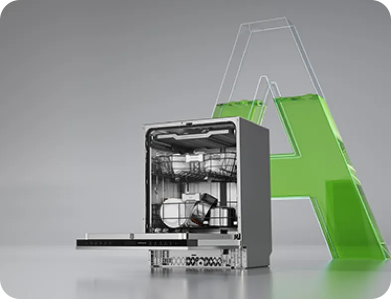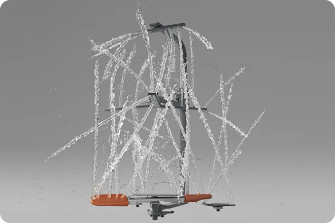 Das 360° HydraFlow-Waschsystem in Kombination mit einem 75 °C-Hochtemperaturprogramm entfernt Fett und Gerüche effektiv – selbst bei unregelmäßig beladenem Geschirr. Die dreistufigen Sprüharme erhöhen die Abdeckung um 45 %. Der obere lineare Sprüharm sorgt für eine vollständige Spülung der gesamten Oberfläche, der mittlere Dreifacharm führt drei Spülgänge in einer Umdrehung durch und der untere Arm verfügt über den innovativen FlexWing-Sprüharm. Dieser Arm verfügt über eine Doppel- und eine Drehdüse, deren beide Enden um 25° schwenkbar sind, um Hochdruckstrahlen abzugeben, wodurch die Abdeckung um 30 % erhöht wird. So werden beide Seiten des Geschirrs gezielt gereinigt – gründlich und rückstandsfrei. Eine verstärkte Sprühzone am Boden und ein spezieller Topfhalter erhöhen die Abdeckung um weitere 15 % und sorgen so für eine gründliche Reinigung stark verschmutzter Kochgeschirre.