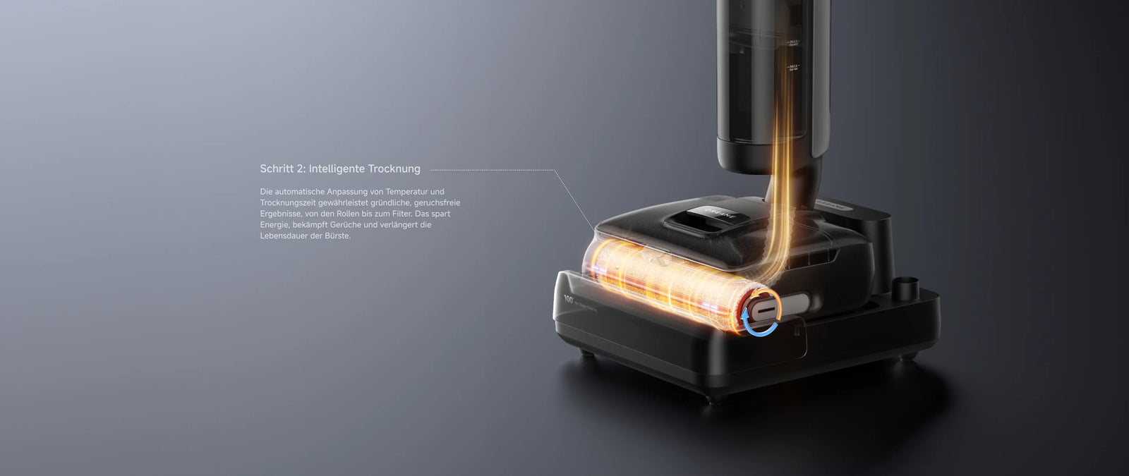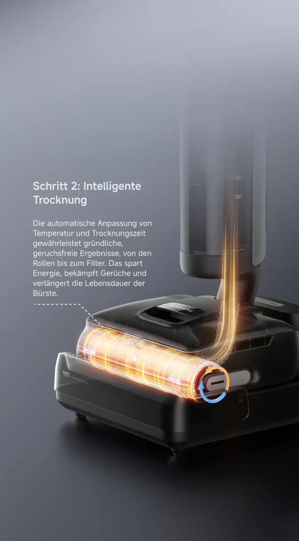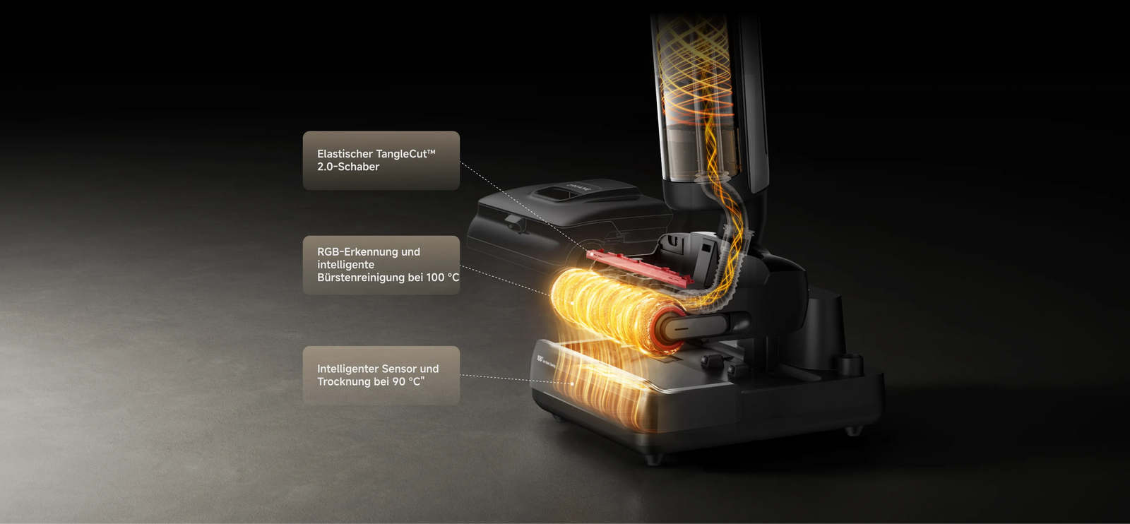 Die Bürste mit 2-Richtungsrotation simuliert die manuelle Reinigung für gründlichere Ergebnisse. Sie entfernt Schmutz, verhindert aufgewickelte Haare und hält die Bürstenabdeckung sauber – nach dem Trocknen ist sie wieder weich, flauschig und bereit für den nächsten Einsatz.