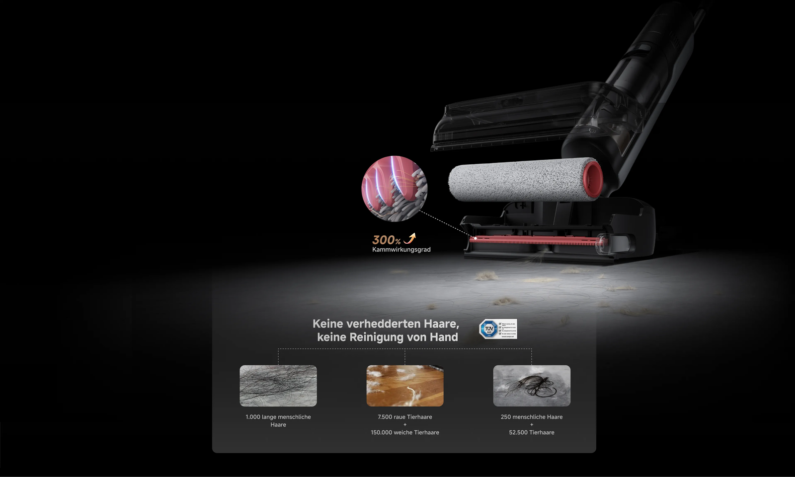 * 100 % verhedderungsfrei: Der H15 Pro FoamWash entfernte ca. 1.000 lange Menschenhaare, 7.500 grobe Tierhaare, 150.000 weiche Tierhaare oder 250 Menschenhaare bzw. 52.500 Tierhaare ohne Verheddern. Basierend auf Tests des TÜV SÜD (China), Shanghai. Bericht-Nr.: 704012501119-01. Die tatsächliche Leistung kann abweichen.