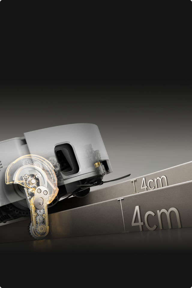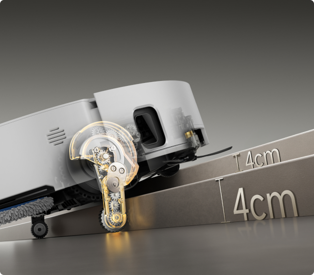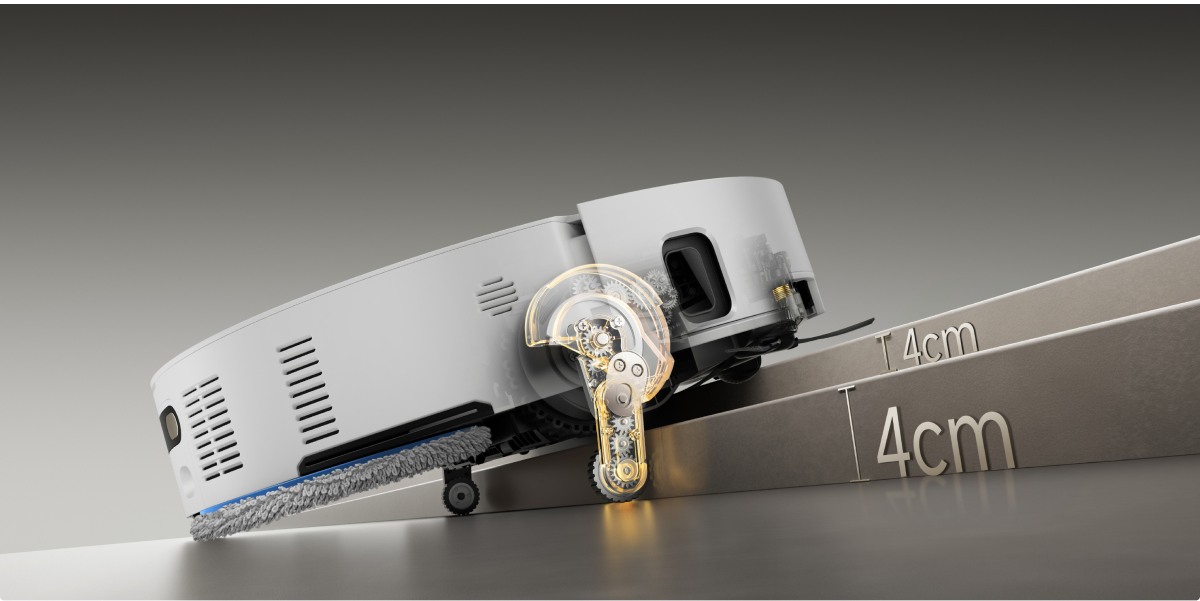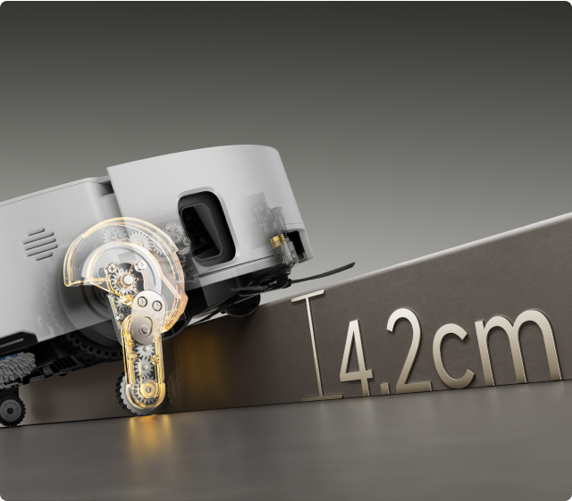 * 8 cm, 4 cm: Bezieht sich auf die Höhe der doppelten Stufe, bei der die Oberfläche der unteren Stufe über 12 cm breit ist, wenn der Saugroboter seine ausklappbaren Beine im Hindernismodus verwendet. Die maximale Höhe einer einzelnen Stufe beträgt 4,2 cm. Basierend auf Daten aus unserem internen Labor. Die tatsächliche Leistung kann abweichen.