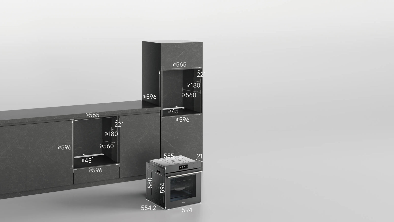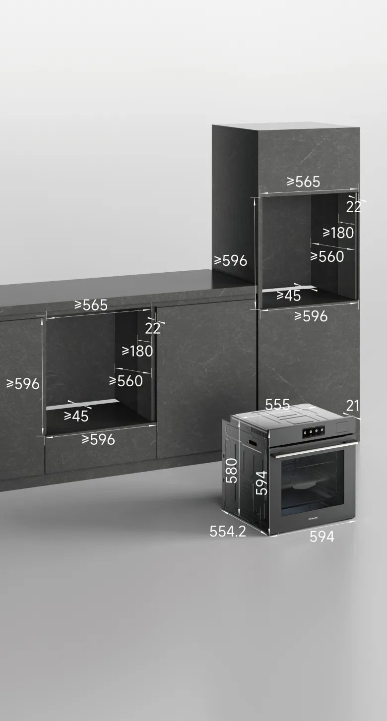 Damit der Einbauherd ordnungsgemäß betrieben werden kann, müssen die Schrankmaße den Vorgaben entsprechen. Den nachstehenden Abbildungen können Sie die erforderlichen Abmessungen für die Installation in einem Schrank oder einer Wandaussparung entnehmen.