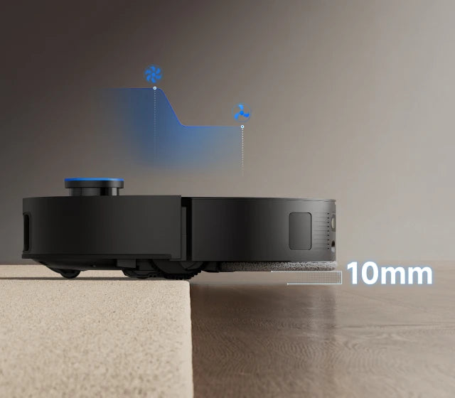 *10,5 mm: basierend auf in unserem internen Labor durchgeführten Tests. Der Höhenunterschied des Saugroboters vor und nach dem Anheben des Wischmopps beträgt 10,5 mm.