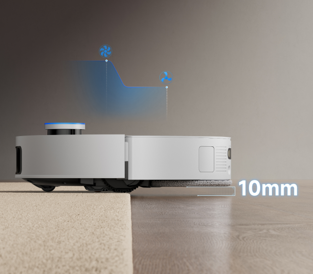 *10,5 mm:  basierend auf in unserem internen Labor durchgeführten Tests. Der Höhenunterschied des Saugroboters vor und nach dem Anheben des Wischmopps beträgt 10,5 mm.