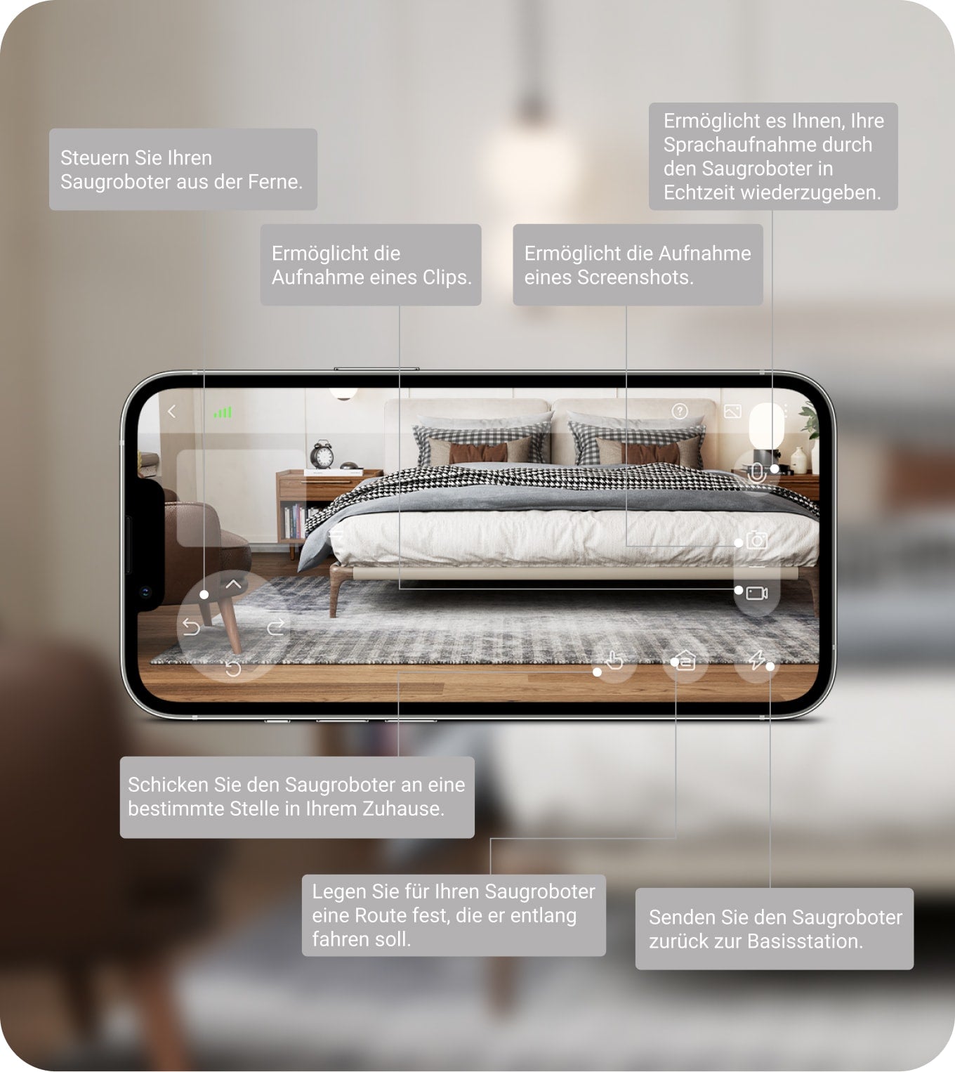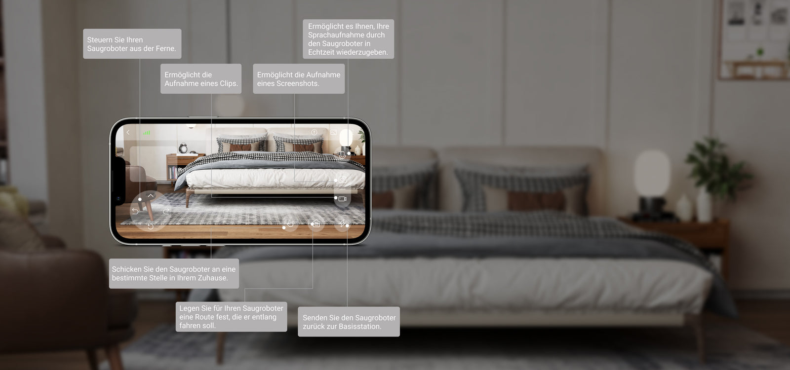 Mit der Remote-Videoüberwachung* können Sie Ihr Zuhause, Ihre Haustiere und Ihre Kinder im Blick behalten und sehen, wo Sie sich befinden. Sie können Ihr Zuhause mit Ihrem Smartphone aus der Sicht des Saugroboters sehen und unter Ihre Möbel schauen.