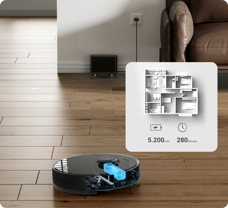 Profitieren Sie dank des 5.200-mAh-Akkus von bis zu 280 Minuten* gründlicher und ununterbrochener Reinigung. Wenn der Akkustand niedrig ist, kehrt der Roboter automatisch zum Aufladen zur Basisstation zurück und setzt die Reinigung an der Stelle fort, wo sie unterbrochen wurde. So können Sie sichergehen, dass Ihr gesamtes Zuhause gereinigt wird.