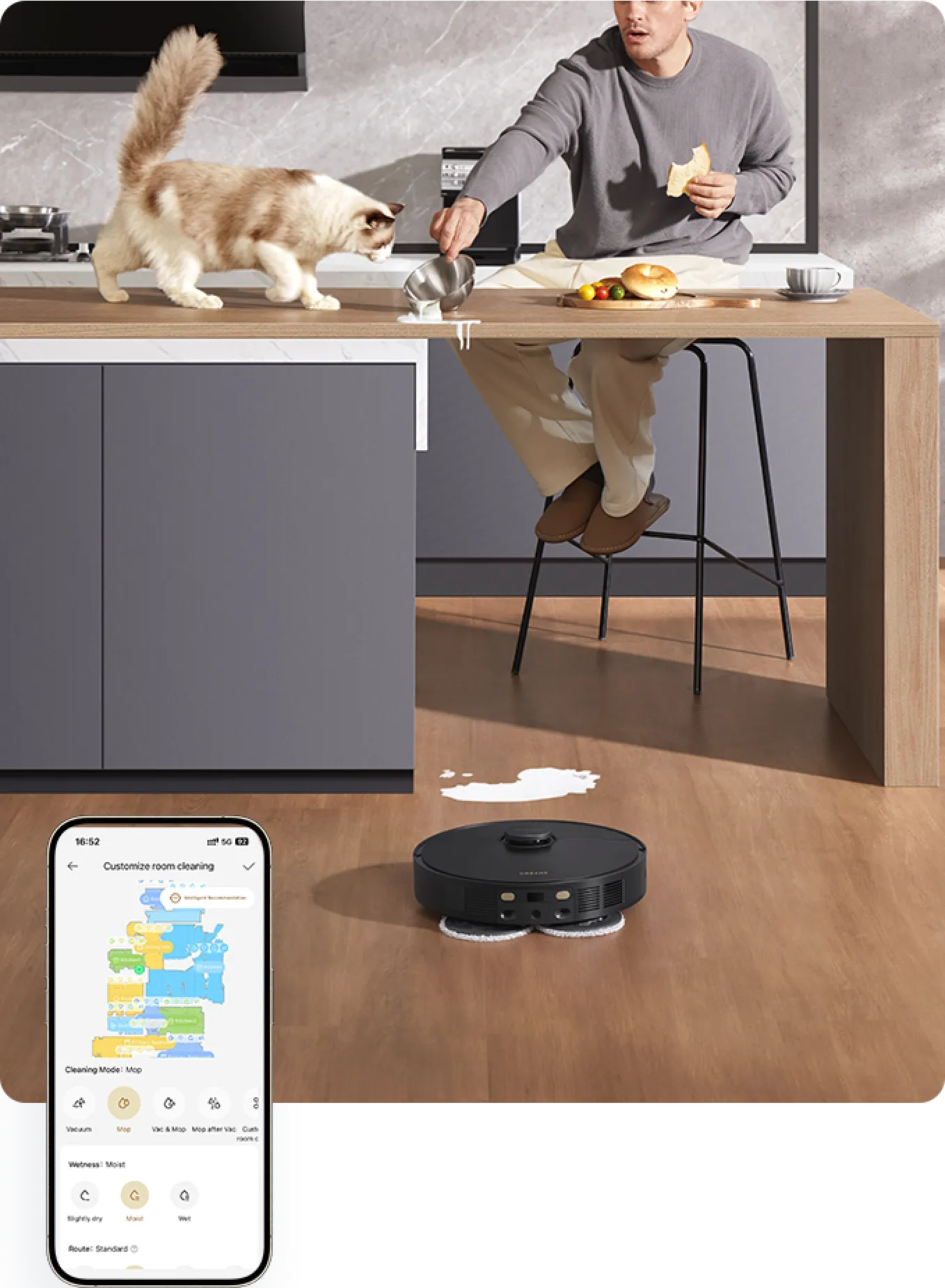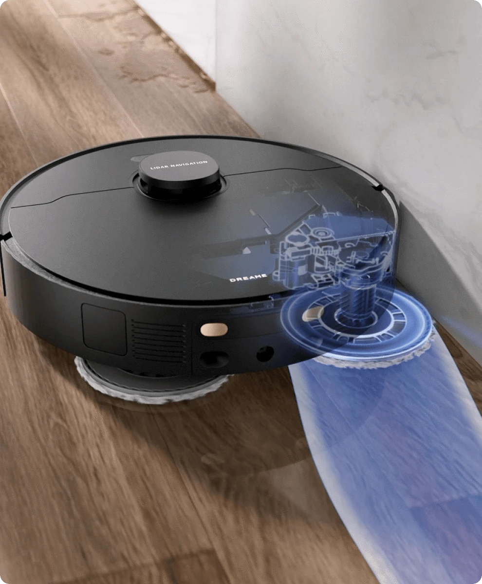 4. MopExtend™ RoboSwing-Technologie: Die Funktion zur Moppverlängerung muss in der Dreamehome-App eingestellt werden. Zertifiziert nach TÜV SÜD-Mindestabstand für die Reinigung entlang der Fußleisten durch Smart-Home-Geräte.